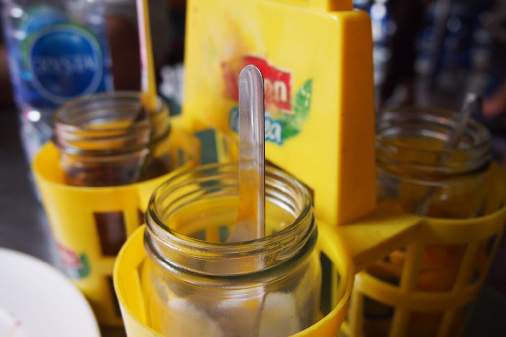 On just about every restaurant or street food stall table in Thailand, you’ll find condiments for diners to add to taste. These can include sugar, ground peanuts, chili paste, dried chili flakes, and sauces or dips made with fish sauce, vinegar, lime, soy sauce and sugar.